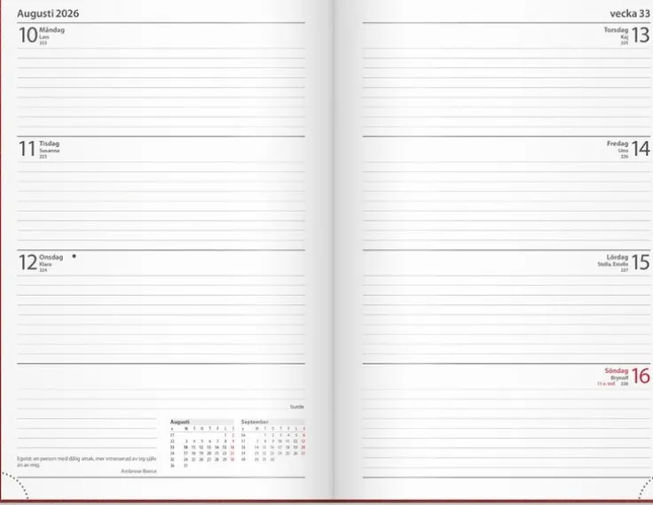 Kalender 2026 från Burde. Format: 150×230 mm. Layout: Liggande. Vecka/uppslag. Kalendarium: 2025-12-22 – 2027-01-03. Omslag: Konstläder. Inbunden. Detaljer: Märkband. Innehåll: Kyrkliga helgdagar, flaggdagar, helgdagar/aftnar, månfaser, namnsdagar, internationella helgdagar översikt, temadagar/händelser, årsöversikt/årsöversikter, årsplan/årsplaner,. Antal sidor: 128. Miljöinformation: FSC®.