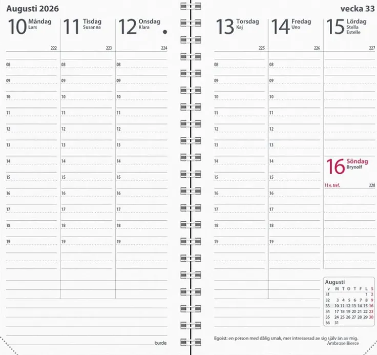 Kalender 2026 från Burde. Format: 83×158 mm. Layout: Stående. Vecka/uppslag. Timindelning 8-19. Kalendarium: 2025-09-15 – 2027-03-14. Omslag: Konstläder. Spiralbunden. Innehåll: Kyrkliga helgdagar, flaggdagar, helgdagar/aftnar, månfaser, namnsdagar, internationella helgdagar översikt, temadagar/händelser, årsöversikt/årsöversikter, årsplan/årsplaner, atlas, telefonregister. Antal sidor: 160. Miljöinformation: FSC®.