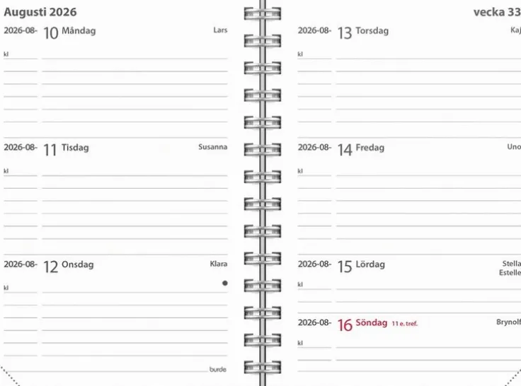 Detta textilomslag med det präglade årtalet ger ett stilrent och elegant intryck som passar året om. Den lilla praktiska veckokalendern!>Kalender 2026 från Burde. Format: 82×127 mm. Layout: Liggande. Vecka/uppslag. Kalendarium: 2025-12-15 – 2027-01-03. Omslag: Linnetextil. Spiralbunden. Innehåll: Kyrkliga helgdagar, flaggdagar, helgdagar/aftnar, månfaser, namnsdagar, internationella helgdagar översikt, temadagar/händelser, årsöversikt/årsöversikter, årsplan/årsplaner, atlas. Antal sidor: 128. Miljöinformation: FSC®.