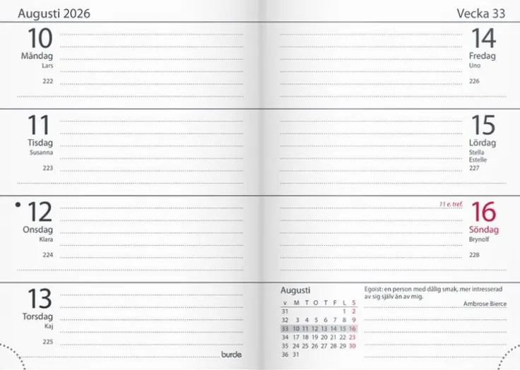 Kalender 2026 från Burde. Format: 70×100 mm. Layout: Liggande. Vecka/uppslag. Kalendarium: 2025-12-22 – 2027-01-03. Omslag: Plast. Inbunden. Innehåll: Kyrkliga helgdagar, flaggdagar, helgdagar/aftnar, månfaser, namnsdagar, internationella helgdagar översikt, temadagar/händelser, årsöversikt/årsöversikter, årsplan/årsplaner, atlas, telefonregister. Antal sidor: 192. Miljöinformation: FSC®.