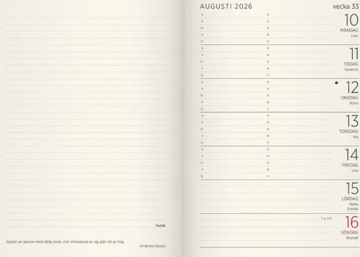 En stilren och exklusiv kalender där fokus ligger på tydlig veckoplanering. Inlagan har ett praktiskt uppslag där högersidan har veckoplanering med liggande layout och timindelning 08-17 och vänstersidan är linjerad för anteckningar. I slutet hittar du 48 extra sidor för anteckningar. Pappret är klassiskt cremefärgat.>Kalender 2026 från Burde. Format: A6. Layout: Liggande. Vecka/uppslag. Timindelning 8-17. Kalendarium: 2025-12-08 – 2027-01-03. Omslag: Konstläder. Inbunden. Detaljer: Gummiband. Märkband. Innehåll: Kyrkliga helgdagar, flaggdagar, helgdagar/aftnar, månfaser, namnsdagar, internationella helgdagar översikt, temadagar/händelser, årsöversikt/årsöversikter, årsplan/årsplaner, linjerade vänstersidor, anteckningssidor rutiga, anteckningssidor linjerade, anteckningssidor olinjerade. Antal sidor: 176. Miljöinformation: FSC® papper.