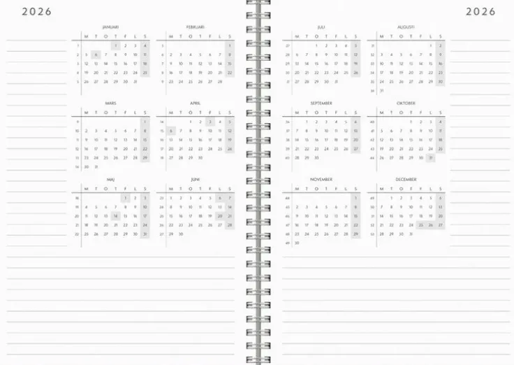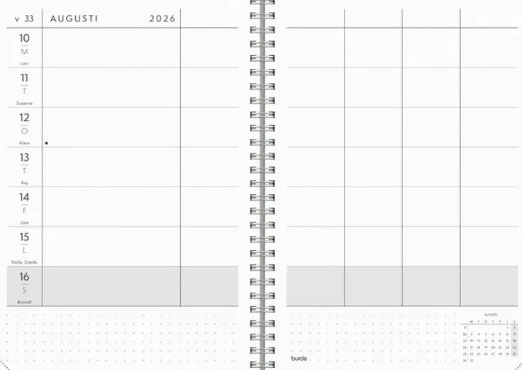 Behöver du hålla koll på fler än dig själv eller kanske olika projekt? Då är veckoplaneraren Plan more den perfekta hjälpredan. I den här kalendern finns 5 extra kolumner för varje dag och du kan smidigt få en överblick över alla aktiviteter, möten och planer.>Kalender 2026 från Burde. Format: A5. Layout: Liggande. Vecka/uppslag. Kalendarium: 2025-12-08 – 2027-01-03. Omslag: Kartong med struktur. Spiralbunden. Detaljer: Gummiband. Pappersficka. Innehåll: Flaggdagar, helgdagar/aftnar, månfaser, namnsdagar, temadagar/händelser, årsöversikt/årsöversikter, årsplan/årsplaner,. Antal sidor: 160. Miljöinformation: FSC®.