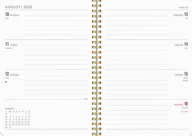 Kalender med en vacker, vit framsida med ett effektfullt präglat mönster. Kalendern har ett uppslag med liggande layout där fokus ligger på tydlig veckoplanering. Inlagans layout passar dig som har mycket på gång, oavsett veckodag. Kalendern är enkel och tydlig med lika mycket utrymme för både vardag och helg.>Kalender 2026 från Burde. Format: A5. Layout: Liggande. Vecka/uppslag. Kalendarium: 2025-12-08 – 2027-01-03. Omslag: Kartong. Spiralbunden. Detaljer: Gummiband. Pappersficka. Innehåll: Kyrkliga helgdagar, flaggdagar, helgdagar/aftnar, månadsöversikter, månfaser, namnsdagar, temadagar/händelser, årsöversikt/årsöversikter, årsplan/årsplaner,. Antal sidor: 144. Miljöinformation: FSC®.