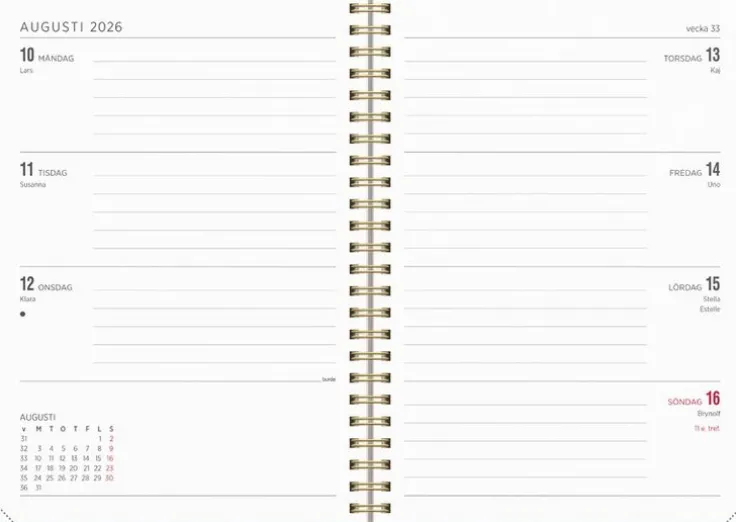 Kalender 2026 med årtal präglat i guld och med en guldspiral. Format: A5. Layout: Liggande. Vecka/uppslag. Kalendarium: 2025-12-08 – 2027-01-03. Omslag: Kartong. Spiralbunden. Antal sidor: 144. Miljöinformation: FSC®.