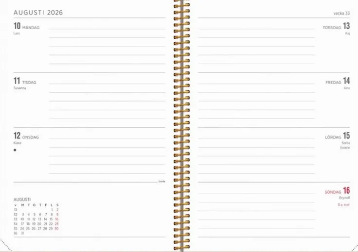 Kalender med mjuk pärm i konstläder med den populära flärpen som kan användas som bokmärke. Kalendern har ett uppslag med liggande layout där fokus ligger på tydlig veckoplanering. Inlagans layout passar dig som har mycket på gång, oavsett veckodag. Kalendern är enkel och tydlig med lika mycket utrymme för både vardag och helg.>Kalender 2026 från Burde. Format: A5. Layout: Liggande. Vecka/uppslag. Kalendarium: 2025-12-08 – 2027-01-03. Omslag: Konstläder. Spiralbunden. Innehåll: Kyrkliga helgdagar, flaggdagar, helgdagar/aftnar, månfaser, namnsdagar, temadagar/händelser, årsöversikt/årsöversikter, årsplan/årsplaner,. Antal sidor: 144. Miljöinformation: FSC® papper.