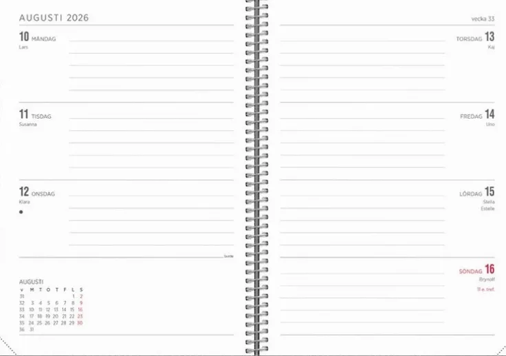 Kalender med mjuk pärm i konstläder med den populära flärpen som kan användas som bokmärke. Kalendern har ett uppslag med liggande layout där fokus ligger på tydlig veckoplanering. Inlagans layout passar dig som har mycket på gång, oavsett veckodag. Kalendern är enkel och tydlig med lika mycket utrymme för både vardag och helg.>Kalender 2026 från Burde. Format: A5. Layout: Liggande. Vecka/uppslag. Kalendarium: 2025-12-08 – 2027-01-03. Omslag: Konstläder. Spiralbunden. Innehåll: Kyrkliga helgdagar, flaggdagar, helgdagar/aftnar, månfaser, namnsdagar, temadagar/händelser, årsöversikt/årsöversikter, årsplan/årsplaner,. Antal sidor: 144. Miljöinformation: FSC® papper.
