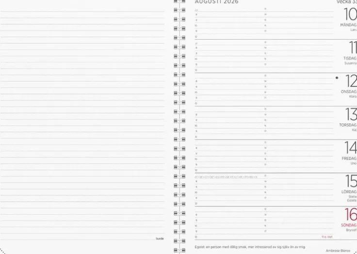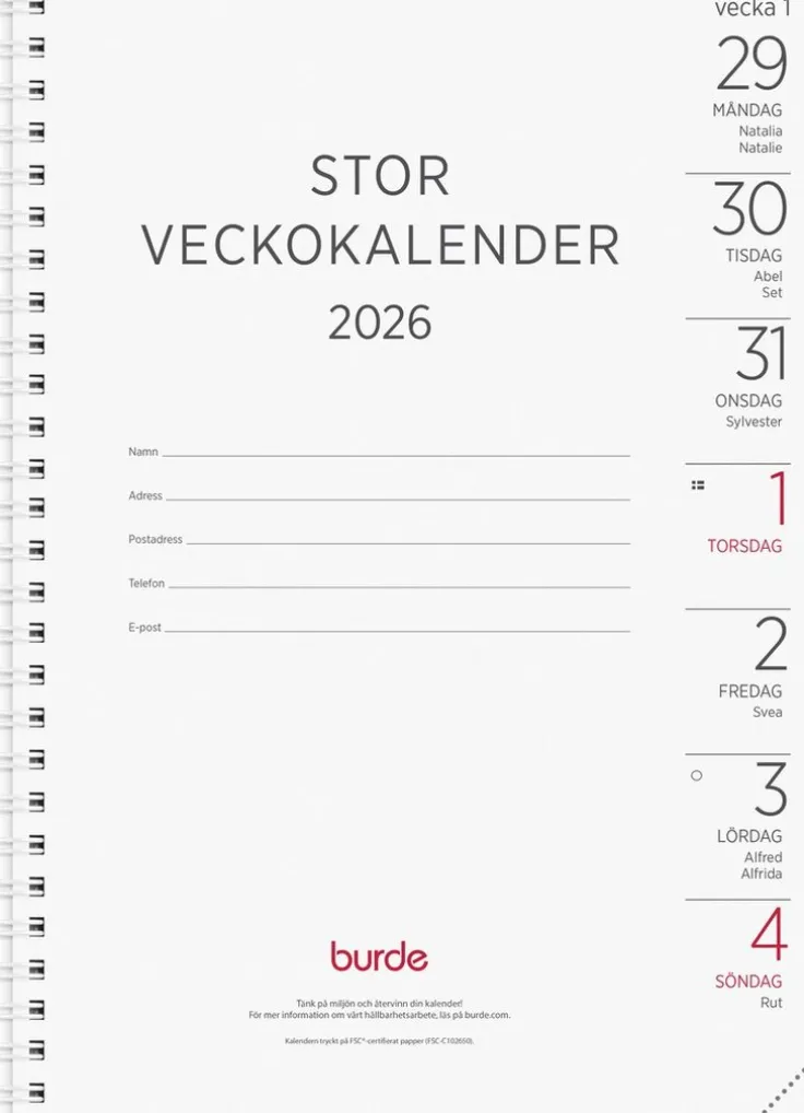 Kalender 2026 från Burde. Format: A5. Layout: Liggande. Vecka/uppslag. Timindelning 8-17. Kalendarium: 2025-12-22 – 2027-01-03. Omslag: Kartong. Spiralbunden. Innehåll: Kyrkliga helgdagar, flaggdagar, helgdagar/aftnar, internationella helgdagar, månfaser, namnsdagar, internationella helgdagar översikt, temadagar/händelser, årsöversikt/årsöversikter, årsplan/årsplaner, linjerade vänstersidor, löst telefonblad. Antal sidor: 112. Miljöinformation: FSC®.