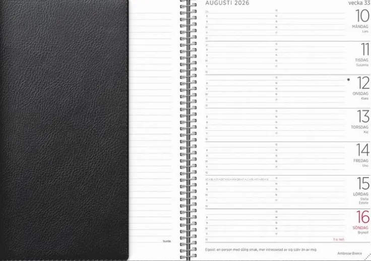 Kalender med mjuk pärm i konstläder med den populära flärpen som kan användas som bokmärke. En klassisk veckoplanering med en vecka per uppslag, där vänstersidan har linjerade sidor för anteckningar och högersidan timindelning 08-17. I slutet hittar du extra sidor för anteckningar och en lättöverskådlig årsplanering. Enkelt och tydligt med fokus på det viktigaste!>Kalender 2026 från Burde. Format: A5. Layout: Liggande. Vecka/uppslag. Timindelning 8-17. Kalendarium: 2025-12-22 – 2027-01-03. Omslag: Konstläder. Spiralbunden. Innehåll: Kyrkliga helgdagar, flaggdagar, helgdagar/aftnar, internationella helgdagar, månfaser, namnsdagar, internationella helgdagar översikt, temadagar/händelser, årsöversikt/årsöversikter, årsplan/årsplaner, linjerade vänstersidor. Antal sidor: 112. Miljöinformation: FSC® papper.
