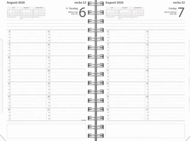 Kalender 2026 från Burde. Format: 135×205 mm. Layout: Dag/sida. Kvartsindelning 8-22. Kalendarium: 2026-01-01 – 2026-12-31. Omslag: Kartong. Spiralbunden. Innehåll: Kyrkliga helgdagar, flaggdagar, helgdagar/aftnar, månfaser, namnsdagar, internationella helgdagar översikt, temadagar/händelser, årsöversikt/årsöversikter, årsplan/årsplaner, urstansat månadsregister. Antal sidor: 400. Miljöinformation: FSC®.