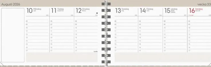 Kalender 2026 från Burde. Format: 148×90 mm. Layout: Stående. Vecka/uppslag. Timindelning 8-17. Kalendarium: 2025-12-15 – 2027-01-03. Omslag: Kartong med struktur. Spiralbunden. Innehåll: Kyrkliga helgdagar, flaggdagar, helgdagar/aftnar, månfaser, namnsdagar, internationella helgdagar översikt, temadagar/händelser, årsplan/årsplaner, telefonregister. Antal sidor: 144. Miljöinformation: FSC®.
