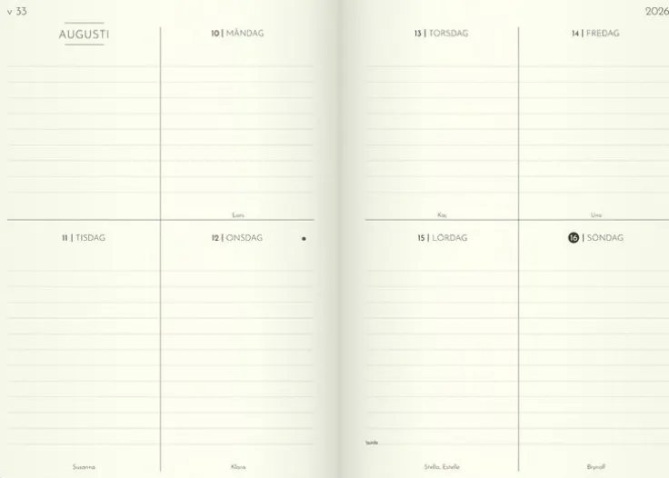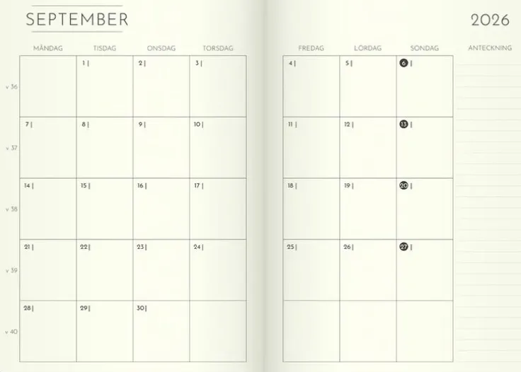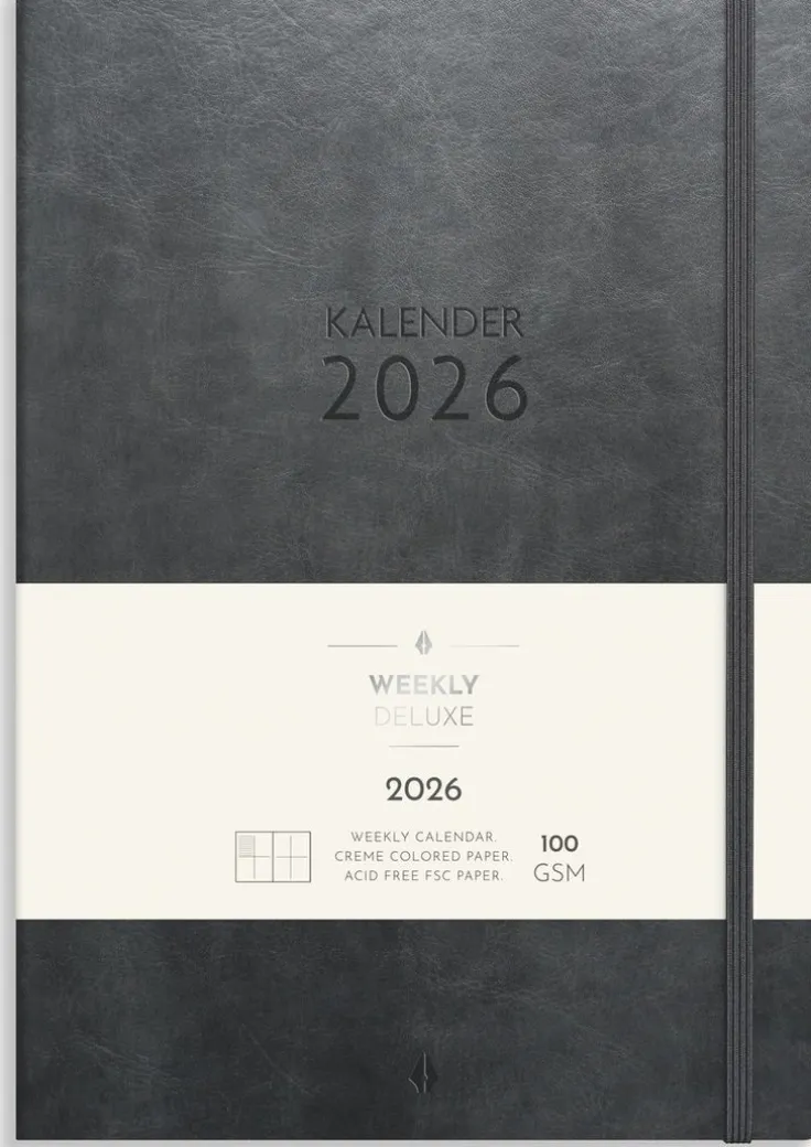 Det här är kalendern för dig som älskar både planering och god design. Tack vare det större formatet har Weekly Deluxe en luftig layout, stilren med veckoindelning och lyxiga detaljer. Eller vad sägs om omslag i mjukt konstläder och smakfull blindprägling? Snyggare planering får man leta efter!>Kalender 2026 från Burde. Format: B5 (176×250 mm). Layout: Stående. Vecka/uppslag. Kalendarium: 2025-12-22 – 2027-01-03. Omslag: Konstläder. Inbunden. Detaljer: Gummiband. Märkband. Pappersficka. Innehåll: Flaggdagar, helgdagar/aftnar, månfaser, namnsdagar, temadagar/händelser, årsöversikt/årsöversikter, årsplan/årsplaner,. Antal sidor: 160. Miljöinformation: FSC® papper.