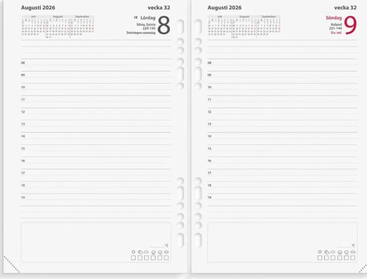 Hålad kalenderrefill till systemkalender med ringmekanism.>Kalender 2026 från Burde. Format: 135×205 mm. Layout: Stående. Dag/sida. Timindelning 8-19. Kalendarium: 2026-01-01 – 2026-12-31. Omslag: Kartong. Innehåll: Kyrkliga helgdagar, flaggdagar, helgdagar/aftnar, internationella helgdagar, månfaser, namnsdagar, internationella helgdagar översikt, temadagar/händelser, årsöversikt/årsöversikter, årsplan/årsplaner, månadsregister. Antal sidor: 400. Miljöinformation: FSC®.