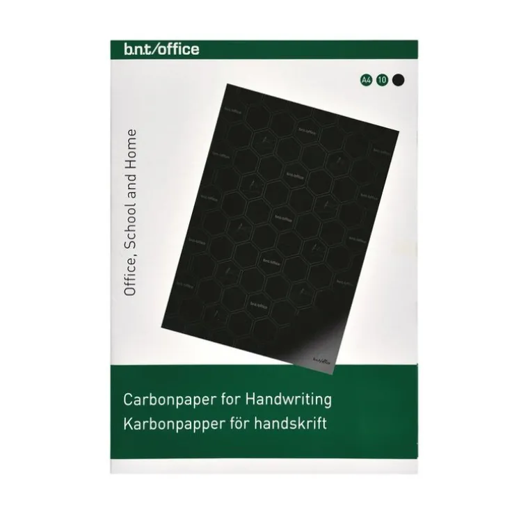Svart karbonpapper för handskrift. Karbonpapper är ett tunt kalkerpapper som används för att framställa kopior. Det ger en tydlig skrift och har en vaxad baksida. Denna varianten är framtagen för handskrift, men kan även användas för skrivmaskin. Varje förpackning innehåller 10 ark i A4.