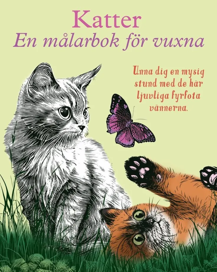 Den här underbara nya målarboken för vuxna är full av katter som hoppar, skuttar, klättrar och busar eller ligger och sover. Du möter fluffiga kattungar, eleganta egyptiska katter och bastanta, gatusmarta typer alla väntar de på att du med dina färdigheter och färgpennor ska göra dem färgrika och livfulla. Många av dem är smyckade med vackra blommönster och geometriska mönster vilket gör det extra roligt att färglägga dem. Sätt dig på en lugn plats där du får vara ifred, ta fram dina färgpennor, välj en katt att arbeta med och unna dig en mysig stund där du färglägger bilden.