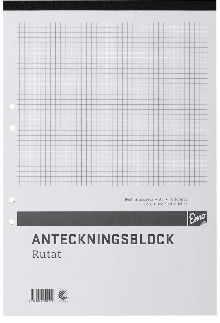 Anteckningsblock häftade på stödskiva. Skrivpapper. Perforerade. A4, rutat, hålat, 60 g, 100 blad.