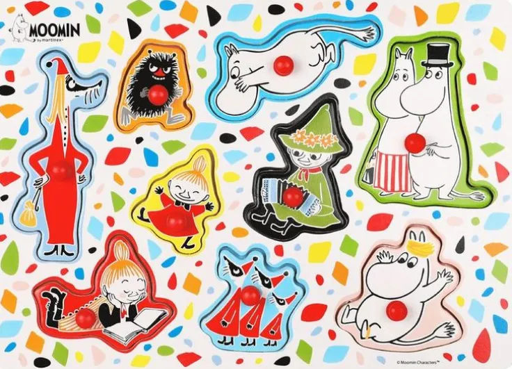 Ett knoppussel till den lilla, med nio pusselbitar i klara, fina färger. Bitarna är formade som muminfigurer och förutom Mumintrollet, Snorkfröken och Lilla My hittar man också Stinky, Snusmumriken, Muminmamma och Muminpappa och familjen Filifjonk. Pusslet är tillverkat i trä med små röda knoppar i plast.