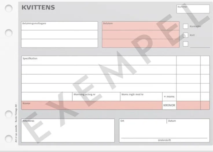 Kvittens i block. Karbonpapper. Klammerhäftad stam i kant. Hålad. 2×50 blad. Format: A5 liggande.