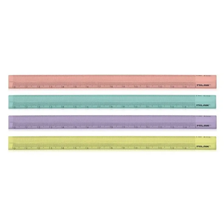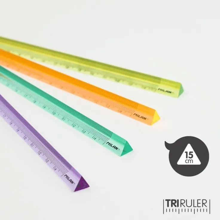 15 cm triangulära transparenta plastlinjaler från MILAN. Färger: gul, orange, grön och lila. New Look-serien.Observera att det inte går att välja färg, ett av alternativen kommer att levereras.