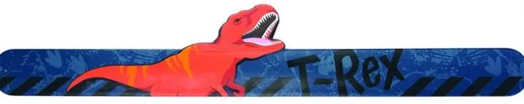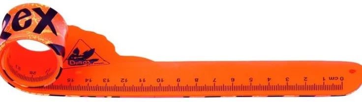 Linjal med dinosauriemotiv. 30 cm lång men kan rullas ihop så den kan få plats i ett pennfodral. Det uppstickande dinosauriehuvudet också gör linjalen till en tuff accessoir. Millimeterskala på en sidan.