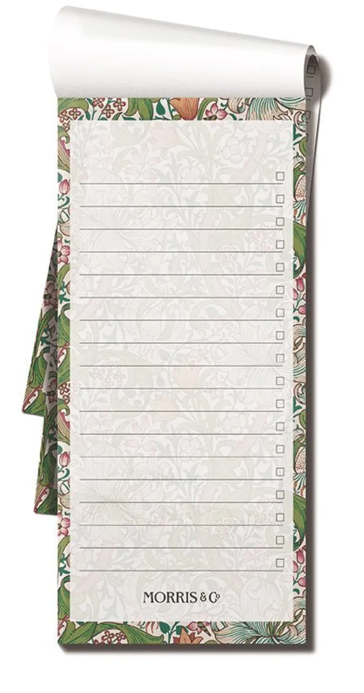 Listblock med dubbla magneter på baksidan. Kraftigt omslag med William Morris mönster. Innehåller 80 linjerade sidor med papper i 80g.Perfekt för alla shoppinglistor och kom-ihåg anteckningar!