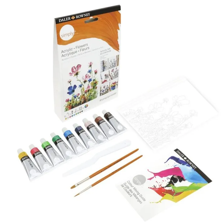 Simply Acrylic Flowers Activity Set från Daler-Rowney är det perfekta start setet för dig som vill prova på att måla med akryl. Detta är ett paint-by-number inspirerat aktivitet set med förtryckta pappers ark för att skapa vackra konstverk med blommotiv. Dessa akrylfärger är snabbtorkande och kan användas direkt från tuben eller tunnas ut med vatten. Setet innehåller: en steg-för-steg guide, 9 tuber akrylfärg á 12 ml i färgerna: peach pink, deep yellow, magenta, dark blue, light blue, light green, leaf green, light brown och brown, samt 2 penslar i olika storlekar, en målarkniv , färgblandningsguide samt 3 förtryckta pappersark för akrylmålning. Tillverkad i Storbritanien.