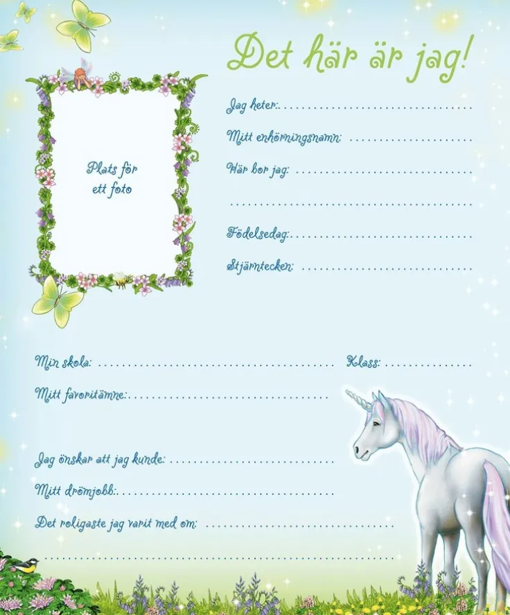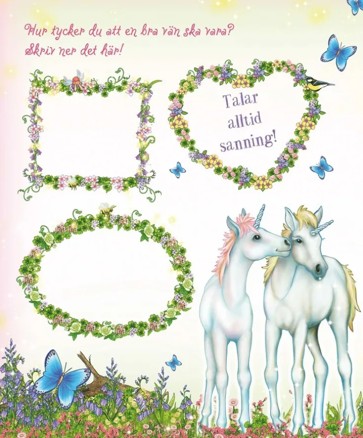 Glitter och magi! En fin fylla-i-kompisbok med enhörningstema. Med äggskalsvitt läsband i siden.