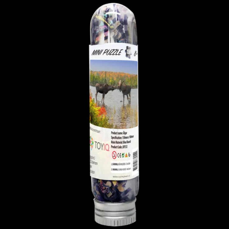 Lägg ett minipussel på 150 bitar med motivet av två älgar i ett fint landskap. När det är färdiglagt har det storleken av ett vykort. Bild på motivet ligger i tuben.