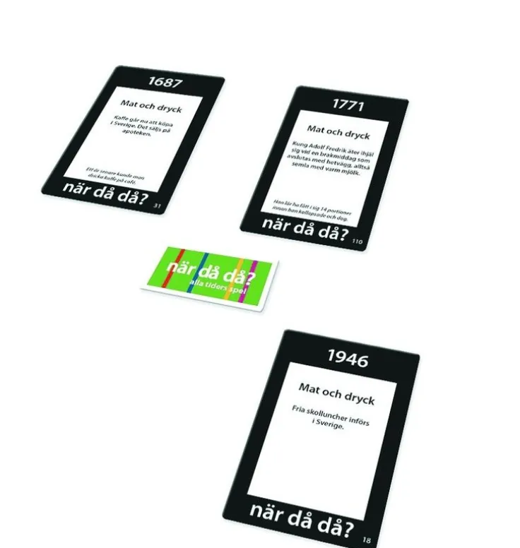 Pocketversion När då då – Mat och dryck. Sätt mat- och dryckrelaterade händerlser i rätt tidsföljd. Spela pocketspelet separat eller ihop med det stora När då då original-spelet.
