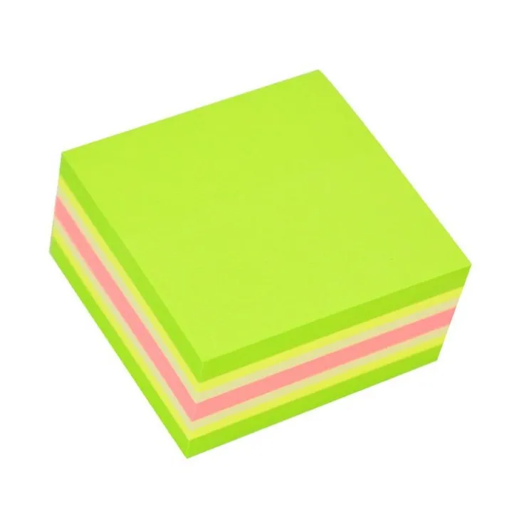 Självhäftande Kom-ihåg-lappar i skiftande lager mellan gul pastell och grön neon som fäster överallt om och om igen utan att skada underlaget. En kub med 250 ark 51x51mm.