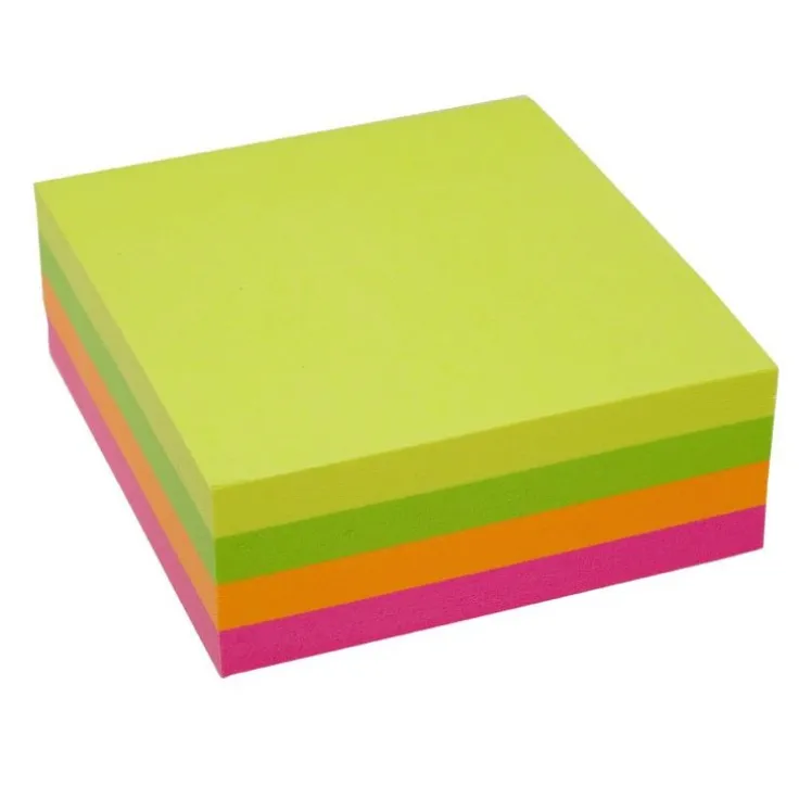 Självhäftande Kom-ihåg-lappar i skiftande lager mellan gul/orange/rosa/grön neon som fäster överallt om och om igen utan att skada underlaget. En kub med 320 ark 76x76mm