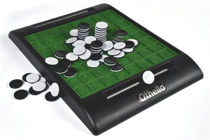 Othello med svarta och vita spelmarkörer och klassiskt grönt bräde, från Alga. Tränar ditt logiska tänkande. Othello bygger på en enkel spelidé som är snabb att lära sig, men det tar år av träning att lära sig de taktiska dragen. Lås in din motståndares brickor och vänd dem till dina. Den som har flest brickor vid spelets slut vinner. Se film här!