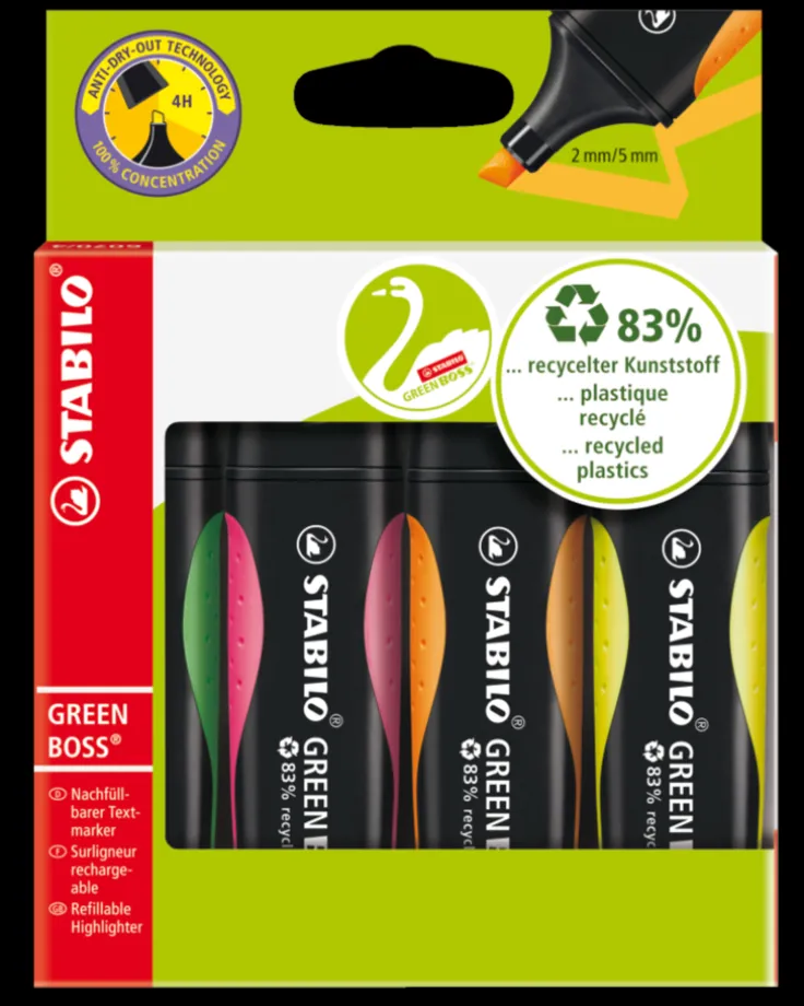 Hållbar överstrykningspenna!Denna STABILO överstrykningspenna kombinerar hög kvalitet med hållbarhet och är det perfekta valet för miljömedvetna konsumenter. Tillverkad av 83% återvunnen plast för att hjälpa till att bevara naturresurserna. Idealisk för långa arbetspass med många överstrykningar. Dess Anti-Dry-Out-teknik hindrar den från att torka ut i upp till 4 timmar utan kork. Tack vare sin supermångsidiga sneda spets kan STABILO GREEN BOSS rita linjer med olika tjocklek (2 mm eller 5 mm) – från breda markeringar för textblock till tunna linjer för anteckningar, understrykning och linjer. Långvarig användning ca 375 m. Vattenbaserat bläck. Det finns fyra neonfärger – gul, orange, grön och rosa. Förresten: visste du att STABILO har ett gemensamt återvinningsprojekt med Coca Cola? ”Procyclen” -plast, som är tillverkad av återvunna Coca Cola-skruvlock, används för att producera STABILO GREEN BOSS. Denna process sparar upp till 50 procent utsläpp av växthusgaser.