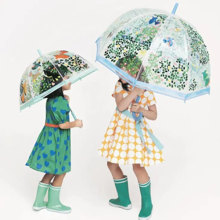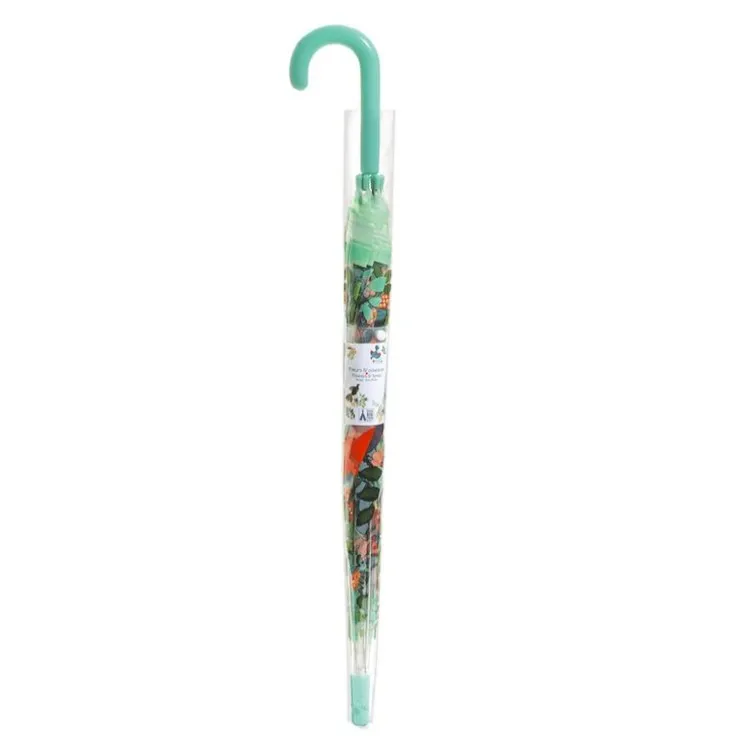 Ett fint barnparaply med motiv av vackra lövverk, blommor och fåglar. Den halvt genomskinliga plasten tillåter både barnet och de vuxna att se varandra. Häftigt också att höra regnet smattra mot plasten! Paraplyets mått utfällt är: Ø 70 x 68 cm