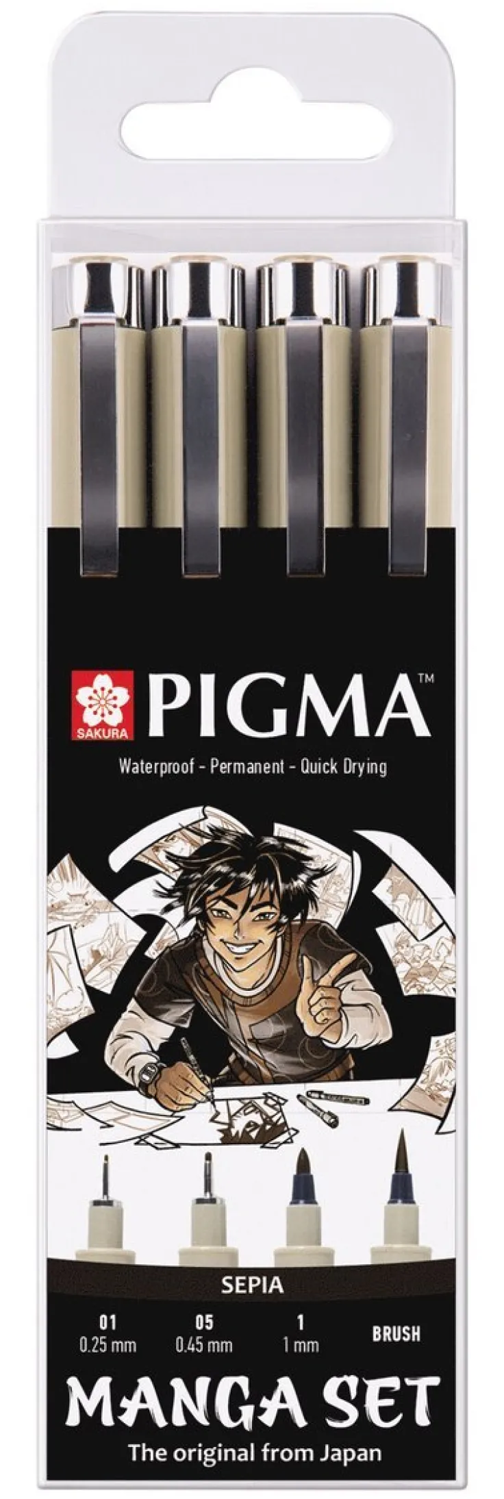 Manga set från japanska Sakura i sepia. Idealisk för Manga illustrationer. Pennorna är syrafria, arkivbeständiga, ljusbeständiga och blöder ej ut eller igenom papper. Innehåller 0,1mm, 0,5mm, 1,0mm och en penselpenna Pigma Brush.