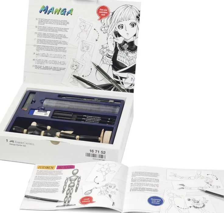 Manga starter-set, med allt som behövs för att börja med manga-teckning. Framtaget av professionella manga-artister. Innehåller: 3 svarta PITT Artist pen med olika spetsar XS 0,1 mm, M 0,7 mm & B pensel. 1 stiftpenna TK-fine 9715 0,5 mm, 1 radergummi, 12 blyertsstift 0,5 mm B, 1 modelldocka samt 1 instruktionshäfte.