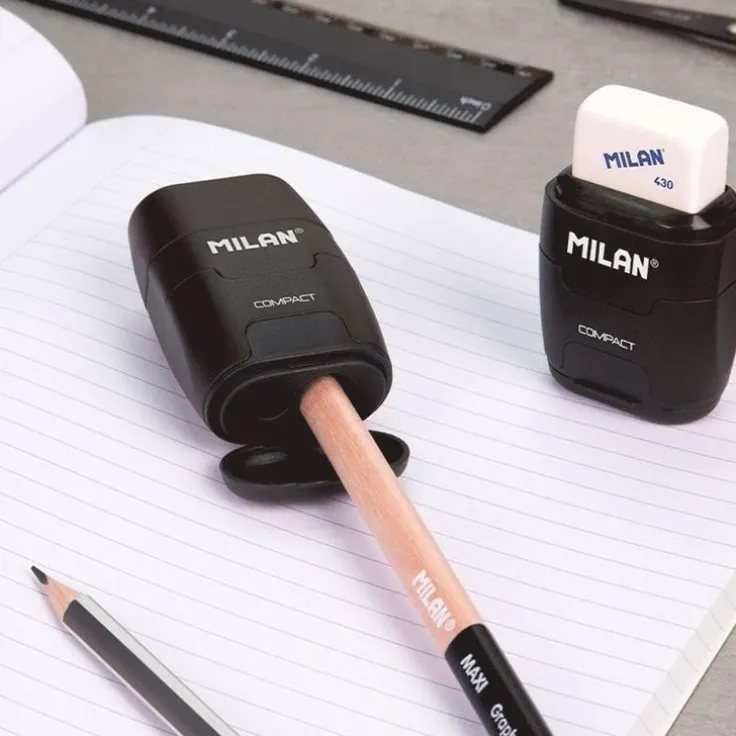MILAN Shadow Compact dubbel radergummi och pennvässare, En unikt helsvart kombination av suddgummi och pennvässare med praktisk utdragbar behållare. Flexibelt, högkvalitativt suddgummi i mjukt syntetiskt gummi. Dubbel pennvässare (standard och MAXI storlek) med vassa och tåliga stålblad som gör att den passar alla sorters pennor. Milans safety blade system förhindrar att bladet kan lossna från pennvässaren. Shadow-serien har en minimalistisk, modern design i helsvart soft touch material. Refill-suddgummin finns tillgängliga.