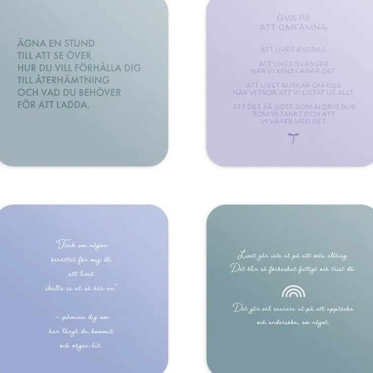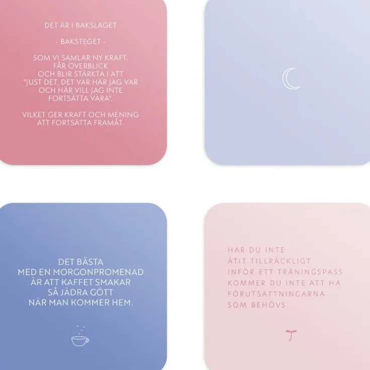 Sofia ”PT-Fia” Ståhls kortlek ”Att vara lagom hälsosam är tillräckligt i en stressad värld” påminner om vad du behöver för att stärka ditt välmående. Den ger perspektiv på skeva hälsoideal och nyanserar hälsa. Kortleken innehåller 100 kort med välriktade påståenden, tankeväckande frågor och ord som lägger fokus där det behöver för att stärka relationen till dig själv – utifrån din dagsform och det du behöver här och nu. Format: 8×8 cm. Miljöinformation: FSC®.