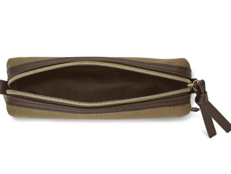 Pennfodral i återvunnen canvas med detaljer i konstläder, som den förstärkande kanten längs med dragkedjan, de smidiga greppen i vardera änden av dragkedjan och det snygga handtaget som öppnar och stänger dragkedjan. Pennfodralet är fodrat i matchande grön färg och dragkedjan är i guldfärg. Ett riktigt fint pennfodral som kommer hänga med länge!