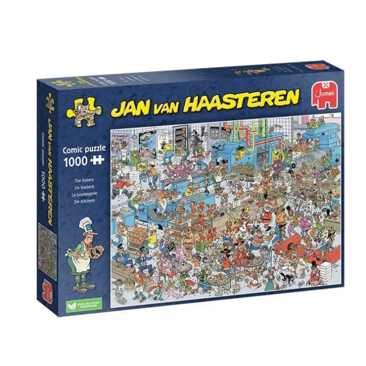 Bröd, bakverk och kakor – alla är specialiteter från Jan van Haasterens bageri. Octo är en riktig produktionsmästare, och Jan har hittat ett väldigt smart sätt att göra spökkakor. Sinterklaas och jultomten kan knappt vänta på sin tur. De här godsakerna måste vara otroligt goda!Ett Jan van Haasteren-pussel är så mycket mer än bara ett pussel – det är en äventyrsserie där välkända karaktärer spelar huvudrollerna i en aldrig sinande miljö full av absurda detaljer. Upptäck de galna äventyren med familjen Jan van Haasteren! Vi är stolta över att våra pussel tillverkas av återvunnet kartongmaterial i Europa. För att skära kartongen till pusselbitar använder vi den tunnaste kniven som finns, vilket ger pusslet ett nästan sömlöst utseende när det är färdiglagt. Njut av detta Jan van Haasteren-pussel!”