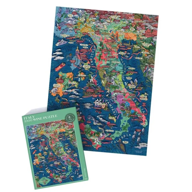 Premiumpussel 1000 bitars. Vinpussel – Italien. Noggrant utvalt av vår egen sommelier, lyfter det italienska vinpusslet fram landets viktigaste vinproducerande regioner, huvudsakliga druvsorter och stjärnappellationer. Lådan innehåller också våra druvprofiler, som beskriver aromer, egenskaper och tips för matkombinationer! Illustrerad för hand, ritades vår design först för hand och granskades sedan noggrant med hjälp av några av världens främsta sommelierer.