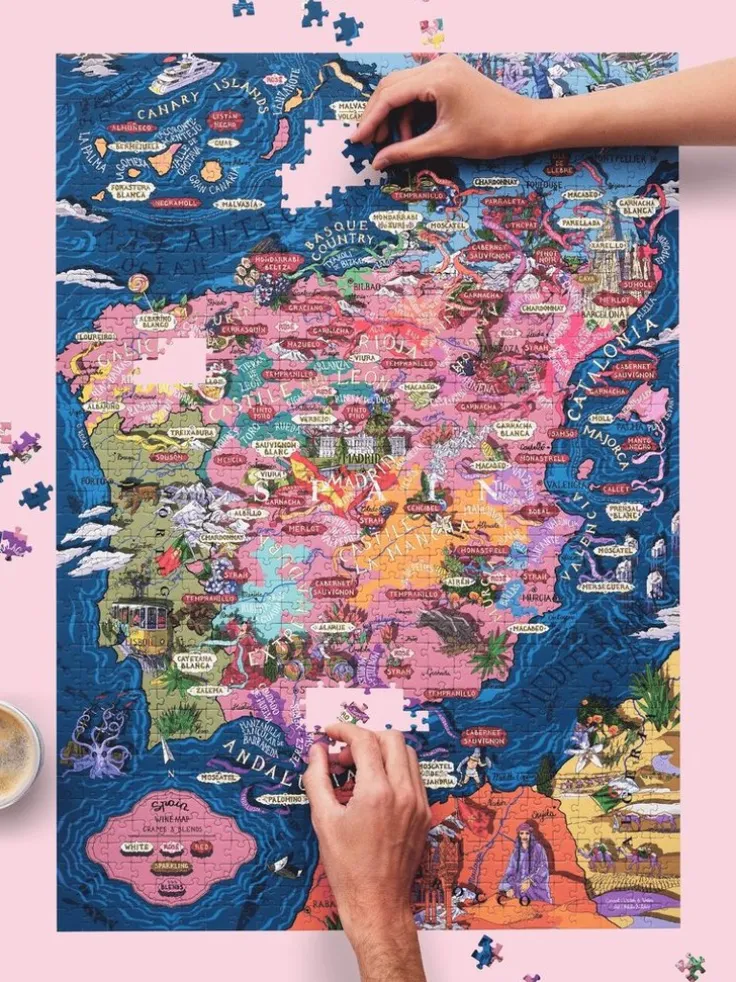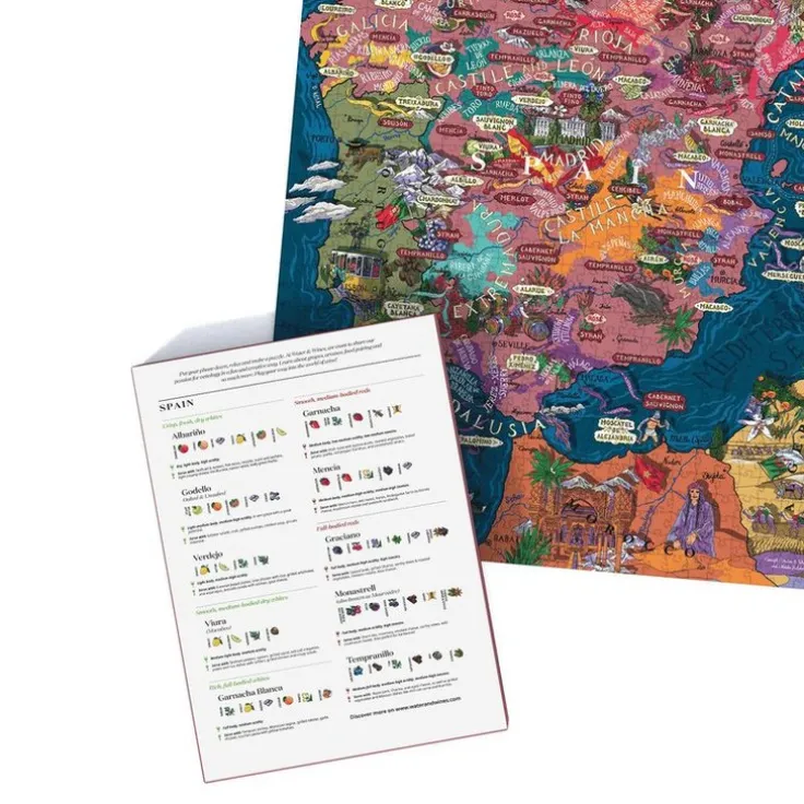 Premiumpussel 1000 bitars. Vinpussel – Spanien. Mot en fantastisk handritad karta över Spanien lyfter vårt spanska vinpussel fram landets viktigaste vinproducerande regioner, huvudsakliga druvsorter och stjärnappellationer. Pusslets design har noggrant utformats av vår egen sommelier och lådan innehåller druvprofiler, aromer, viktiga egenskaper och tips för matkombinationer! Illustrerat för hand har vårt team noggrant granskat varje detalj med hjälp av några av världens främsta sommelierer.