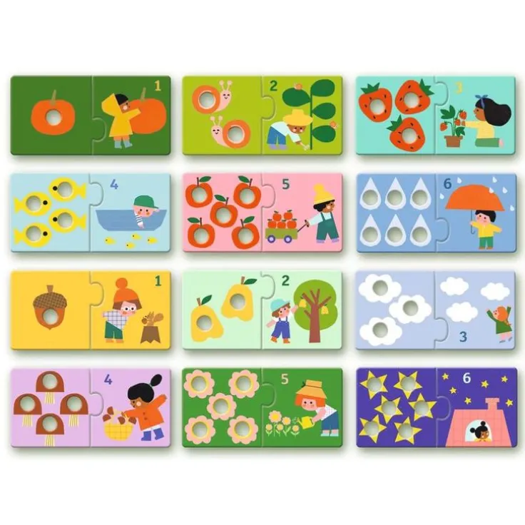 Ett lekfullt sätt att lära sig räkna från 1-6 ! Detta färgglada 2-bitarspussel från Djeco innehåller 24 pusselbitar (12 par) där barnet matchar siffror, föremål och antal genom att räkna med fingrarna i hålen. Pusselbitarna är enkla att greppa och självkorrigerande – bara rätt bitar passar ihop! Kommer i en praktisk förvaringslåda med handtag.