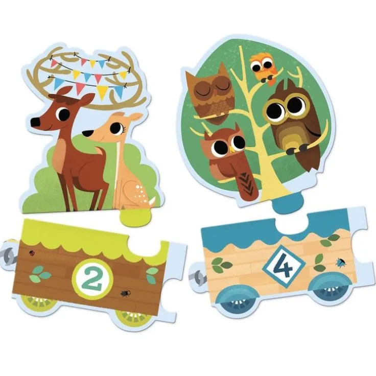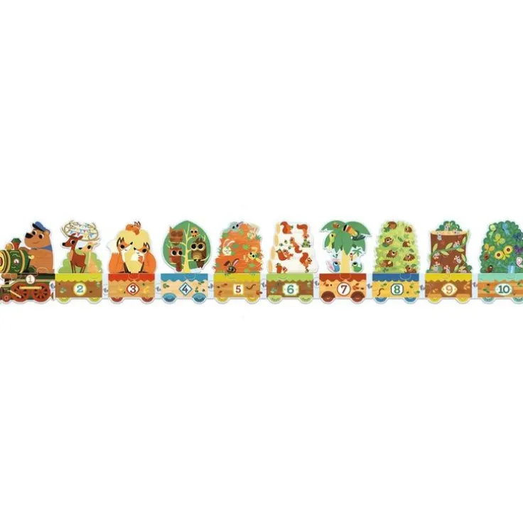 Ett roligt, färggrant och pedagogiskt pussel för de yngre barnen utformat som ett långt tåg med skogens djur som passagerare och som låter barnet öva på siffrorna 1 till 10, antal samt numerisk ordning. Pusslet är självkorrigerande då bitarna bara kan läggas på ett sätt för att passa ihop perfekt. Det består av 20 bitar och blir ca 16 x 102 cm stort.