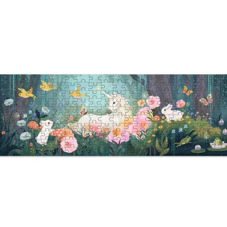 Ett vackert och fantasifullt 200-bitars pussel med ett ovanligt långsmalt format (ca 33 x 97 cm) som gör det både överskådligt och roligt att lägga. Motivet visar en magisk skogsglänta där en enhörning vilar bland blommor och charmiga djurvänner – fullt av små, spännande detaljer att upptäcka. Ett inspirerande sätt för barn och vuxna att utforska illustration och form, samtidigt som de tränar koncentration och tålamod. Levereras i dekorativ ask med affisch i naturlig storlek vilken kan användas som en referens när man lägger pusslet. Tillverkat i Europa.