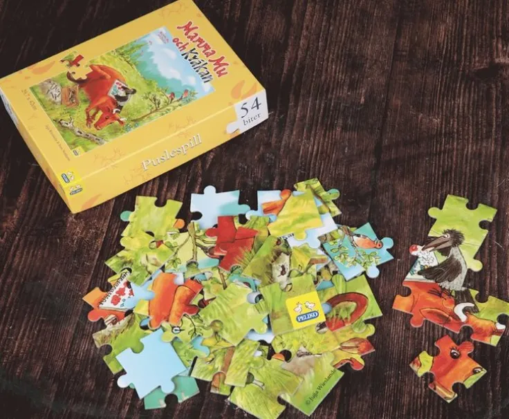 Mamma Mu pussel av papp, med härligt motiv av Mamma Mu och Kråkan i fina färger. Pusslet kommer i kartong och består av 54 bitar där det lagda pusslets storlek är 30 x 42 cm.