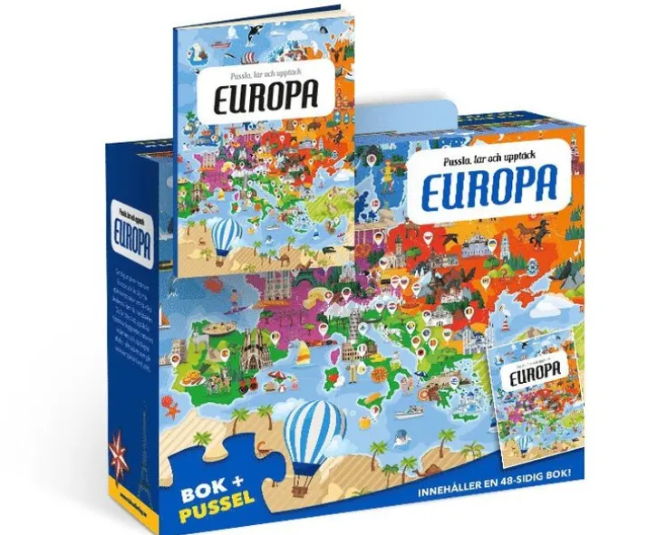 Ge dig ut på en resa i Europa och lär dig nya, spännande saker om de olika länderna i vår världsdel. Du får chans att upptäcka historiska byggnader, naturens underverk och storslagna städer allt sådant som gör varje europeiskt land unikt. Dessutom får du pussla fram en bild av Europa! Ett runt pussel med 210 bitar.
