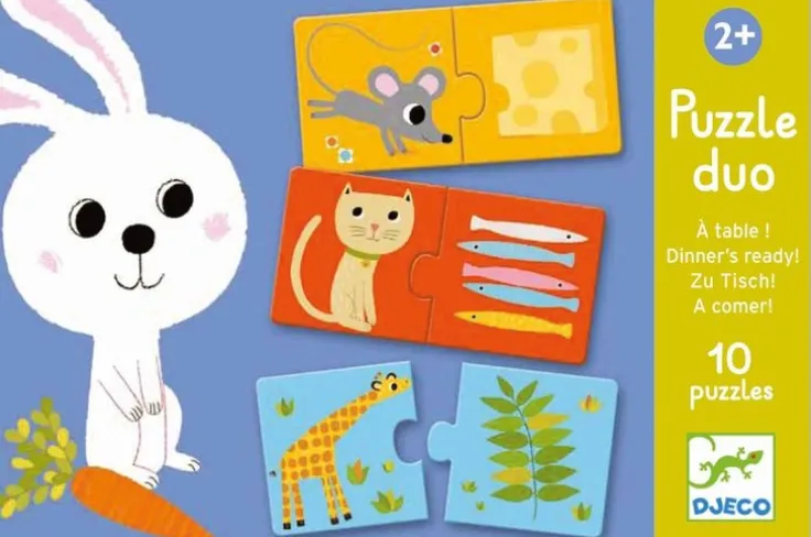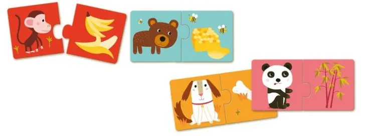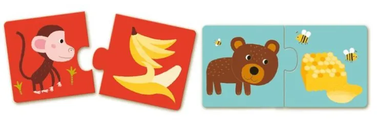 Illustrerat barnpussel i 10 motiv där varje pussel har 2 bitar. Ett färgglatt och chamrigt barnpussel från Djeco där motiven har djur och deras mat som tema. Matcha rätt djur med rätt mat, även färgerna på pusselbitarna hjälper till för att det ska bli rätt. Pusselbitarna är gjorda av kraftig kartong och förpackade i en snygg ask. En perfekt present till det lilla barnet!