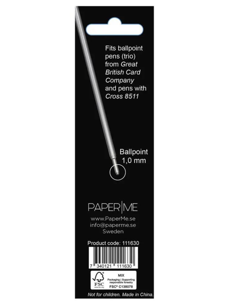 Refill i 2-pack. Den ena patronen har blått bläck och den andra patronen har svart bläck. Stiftbredd 1,0. Passar till kulspetspennorna i ask: Kulspetspenna 3st i ask Strawberry Thief – William Morris och Kulspetspenna 3-pack William Morris : Strawberry Thief Blush som finns i Akademibokhandelns sortiment. Patronerna motsvarar Cross Refill 8511.Kontaktinformation:PaperMeTryffelslingan 1618157 Lidingö[email protected]