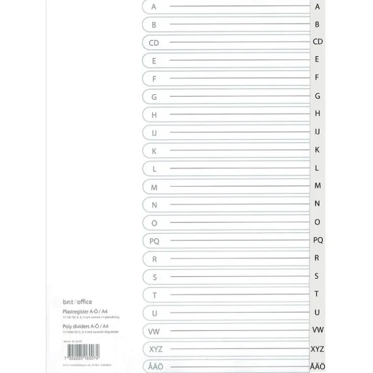 Plastregister A-Ö. PP-flikar med indexsida i papper. 11 håls multihålning för 2,3,4 och Svenskt hålavstånd.