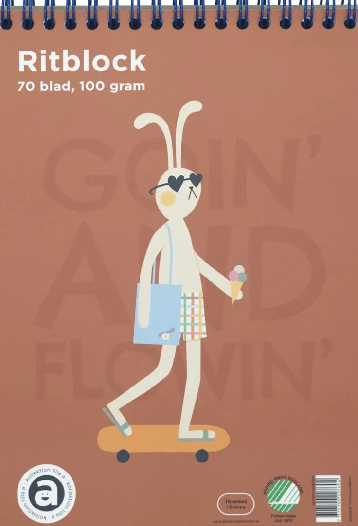 Spiralbundet ritblock i A5-format med motiv av en cool kanin som åker skateboard. Ritblocket har 70 blanka blad som passar till kritor, vattenfärg, tusch-och färgpennor. Svanenmärkt. Tillverkad i Europa. 70 blad. Unik design, illustration av Emma Ljungberg. Ingår i Akademibokhandelns egen kollektion – Kollektion lilla a.